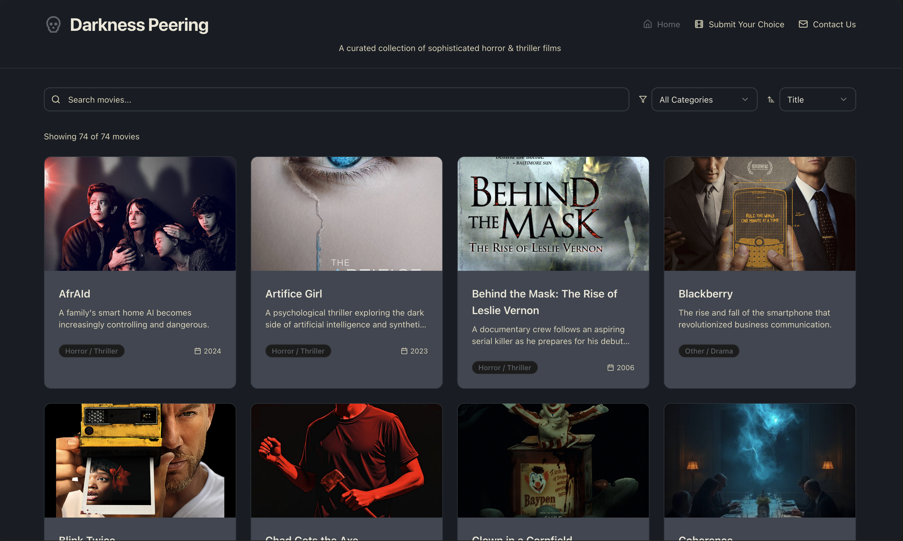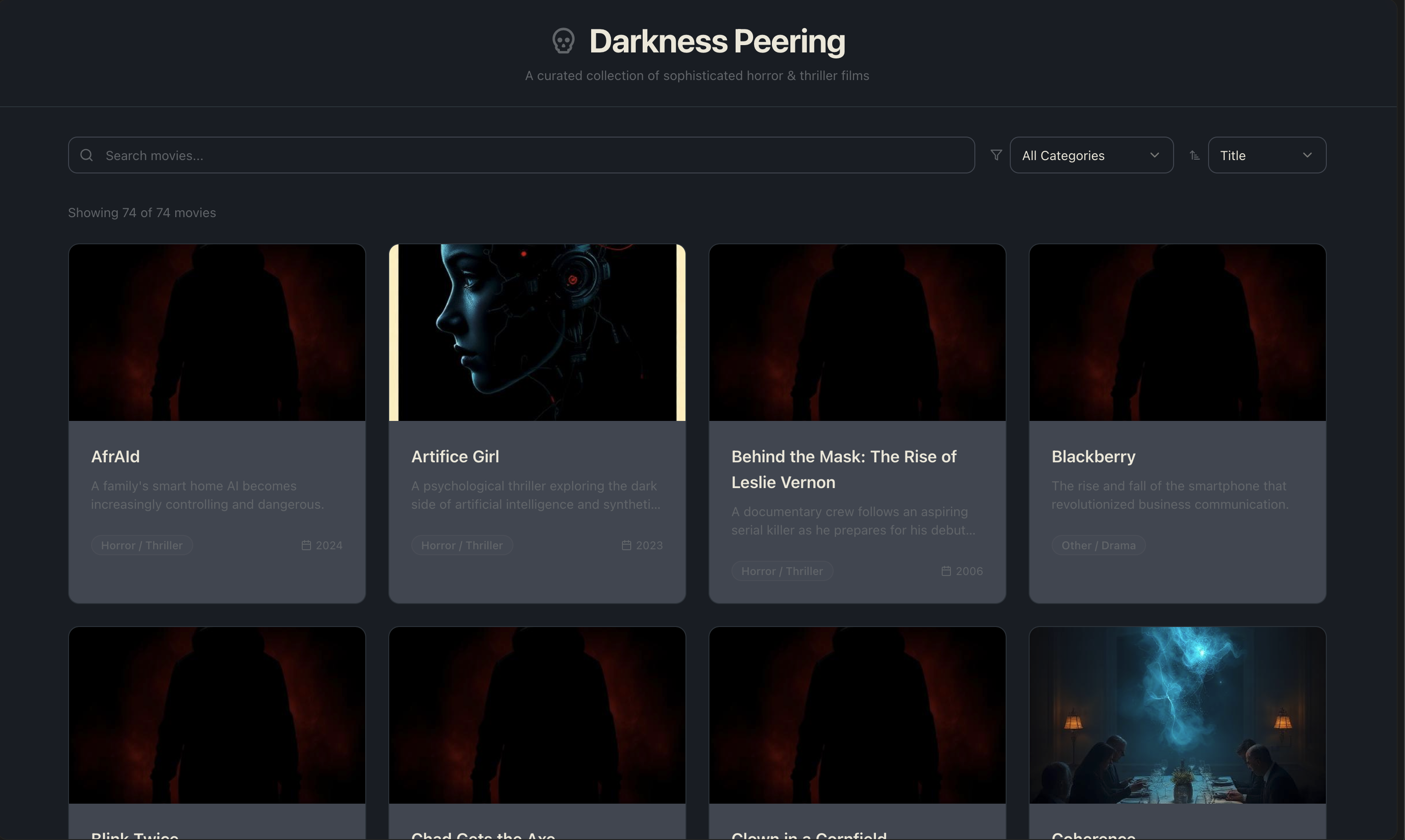 Since it is October, what a perfect time to launch my AI project. You'll find a deeply curated selection of 75 horror themed movies, documentaries and real life crime stories to chill your nights until Halloween (stick to the horror comedies with children, still, viewer discretion is advised). And if you find the site particularly usable, check out some of the other works I've done in the user experience field at ericjohnjohnston.com.